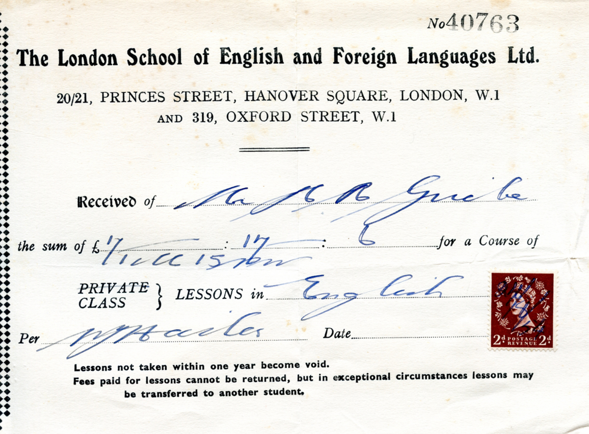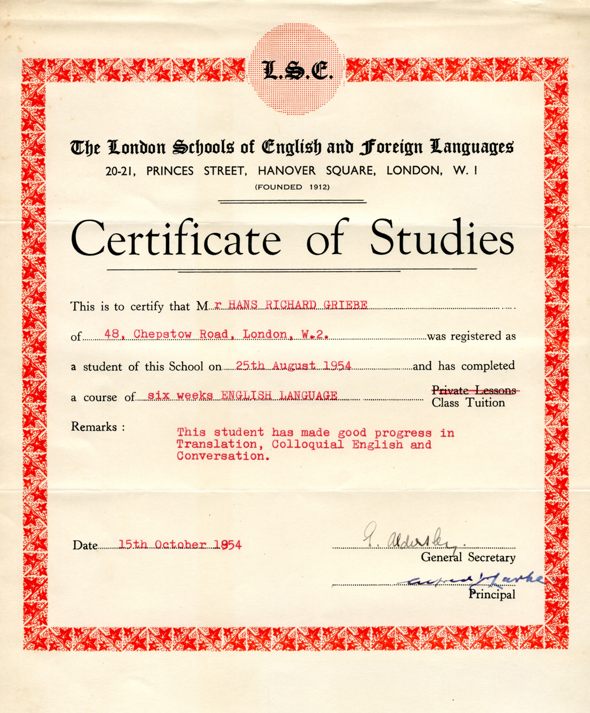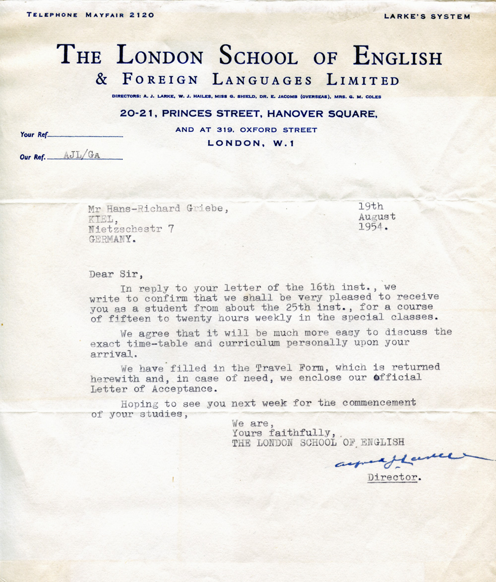 Hans Richard Griebe, a German living in Kiel in 1954, travelled to London in August, to do a short course of Conversational and Colloquial English at the London School of English.