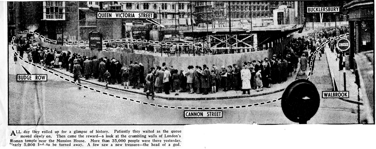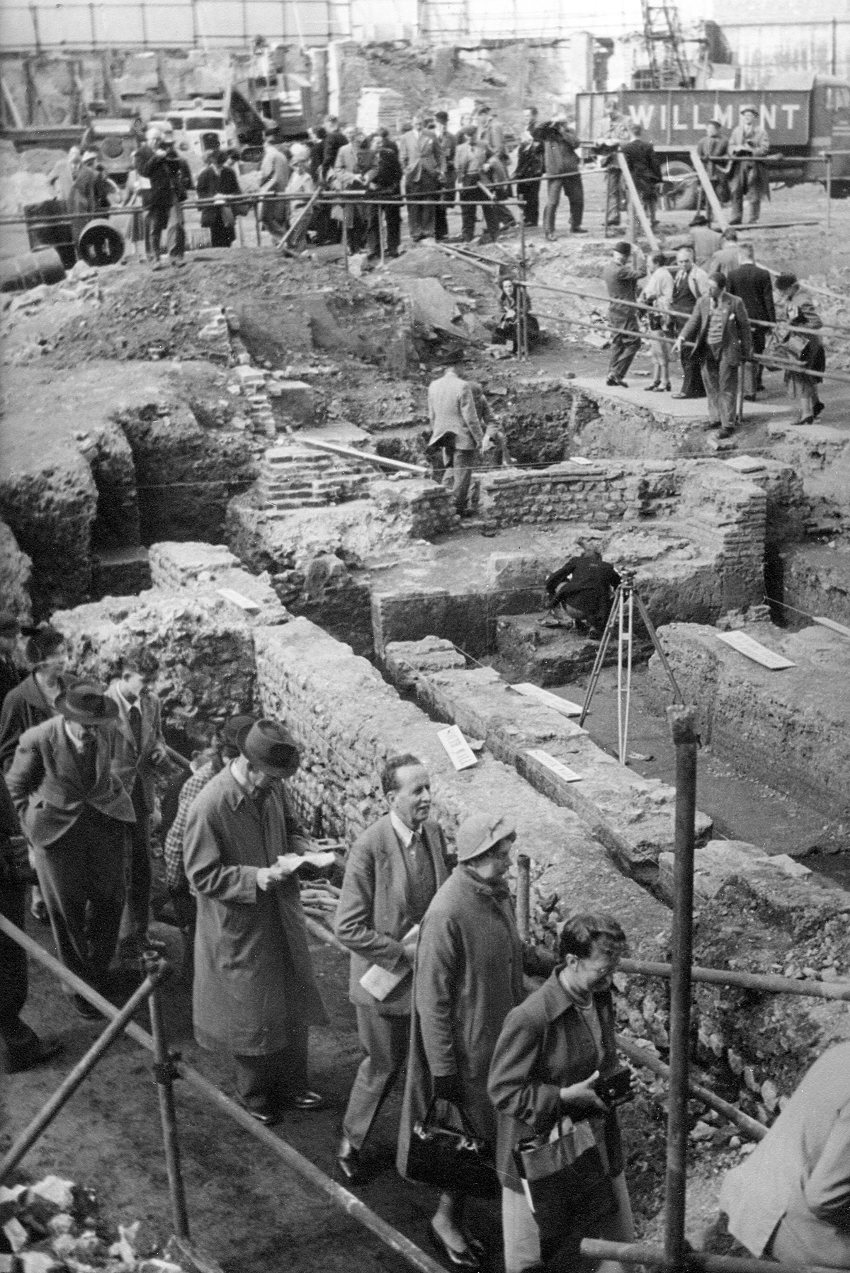 The sequence of themes in London Town 54 sticks to the sequence of events and themes that Hans Richard chose for his scrapbook. Besides Themes such as Rush Hour or Tradition, he also included two news photo essays that he shot. One is the discovery on 24 September, 1954 of the Roman Temple to the Roman god Mithras near the Mansion House in the City of London. The other photo essay covers the state visit of Emperor Haile Selassie of Ethiopia to London in 14 October 1954, a few days before Hans Richard was to return to Germany. Throughout London Town 54, any captions that he wrote I reproduce in italics. Those that I have attached to a photo are in non-italics.