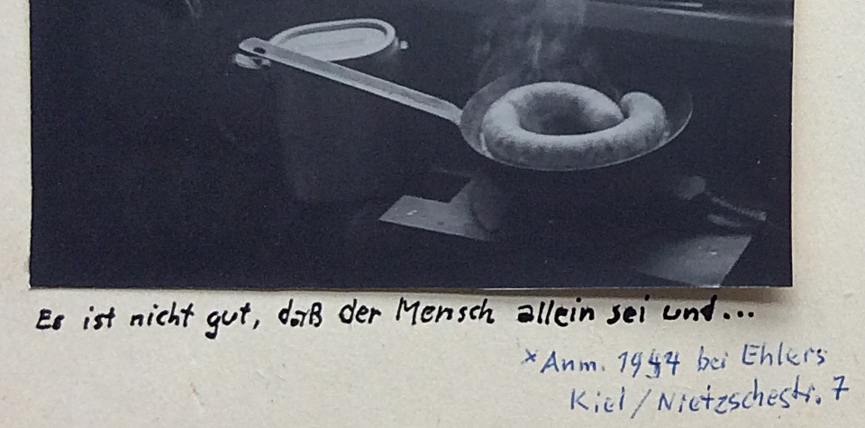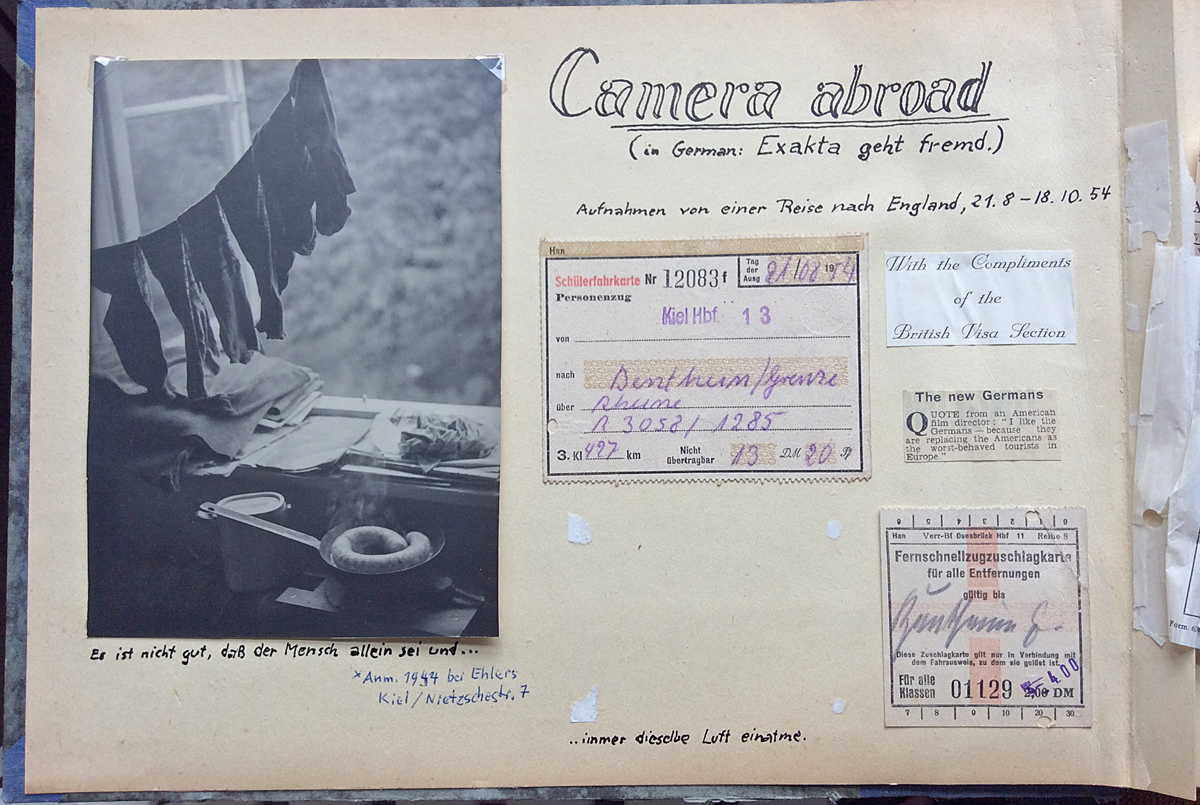 Es ist nicht gut, das der Mensch allein see und… “It is not good that man should be alone…” From the opening page of his scrapbook. The addition in ballpoint pen is from the 1980s – it is the Kiel address he was staying at in 1954.